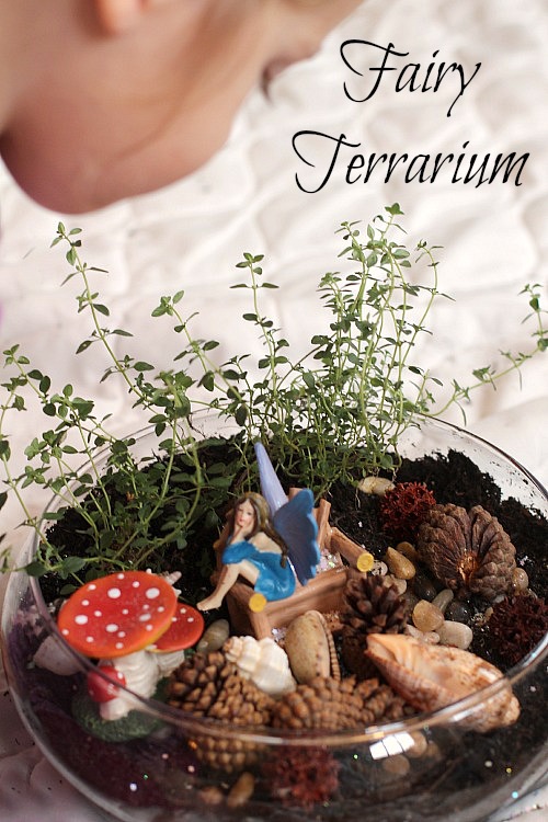 All we needed to provide was soil and any plants we wanted to include. We borrowed some potting soil from one of our dormant pots in the garden and selected a $2 lemon thyme plant from a local store to provide Blue with some greenery- the twins liked the tiny “fairy leaves” and the tangy aroma added a nice sensory element. We will most likely be adding some more plants to our terrarium come spring as pickins are a bit slim at this time of year in the foliage department. More herbs and/or some tiny succulents would be perfect for our little terrarium.