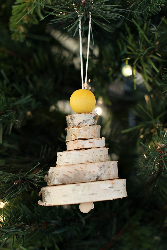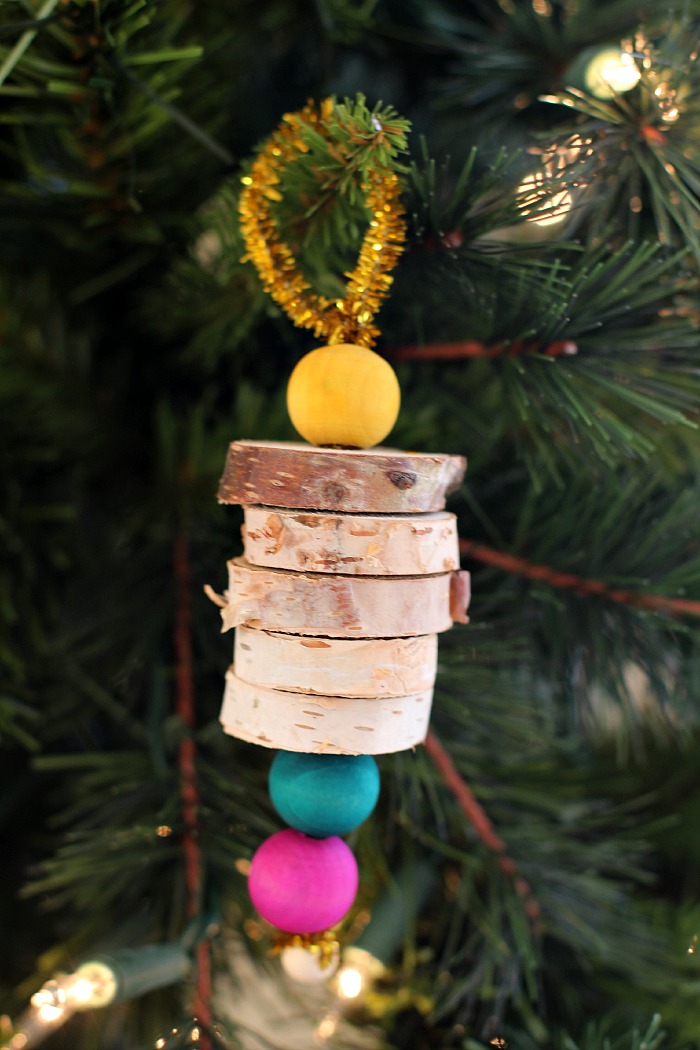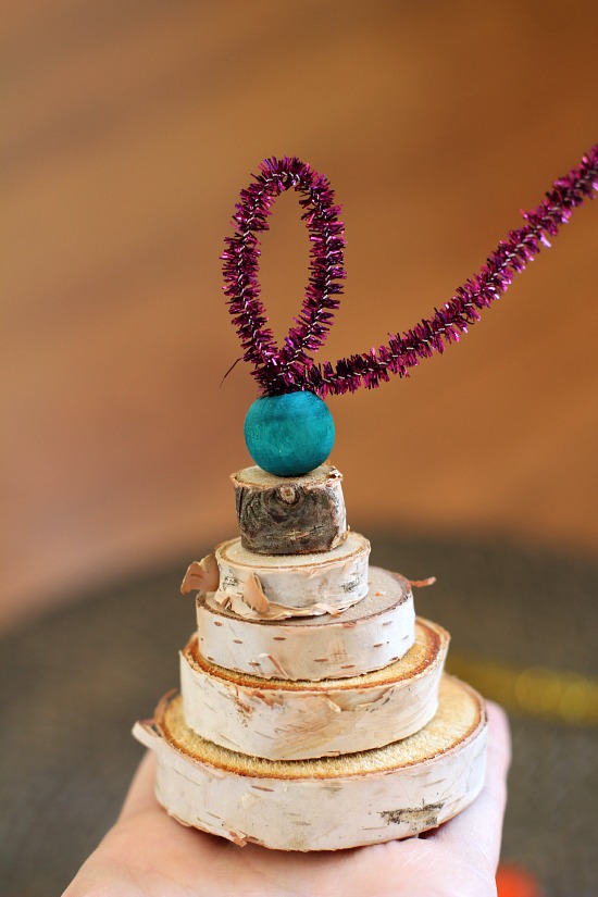 If you prefer a less sparkly version (you hipster, you) feel free to use bead cord or embroidery thread in place of the pipe cleaner. You’ll just have to tie it a bit differently- thread it down through the tree slices, through the bead, and then back up through the slices again so both ends are coming out of the top bead. Tie them off and you have a loop for hanging.