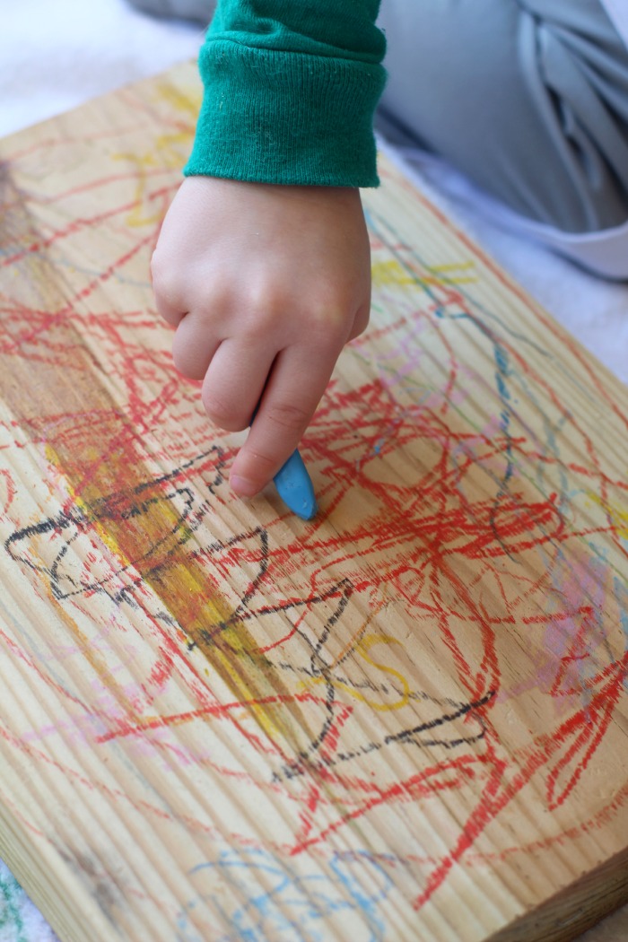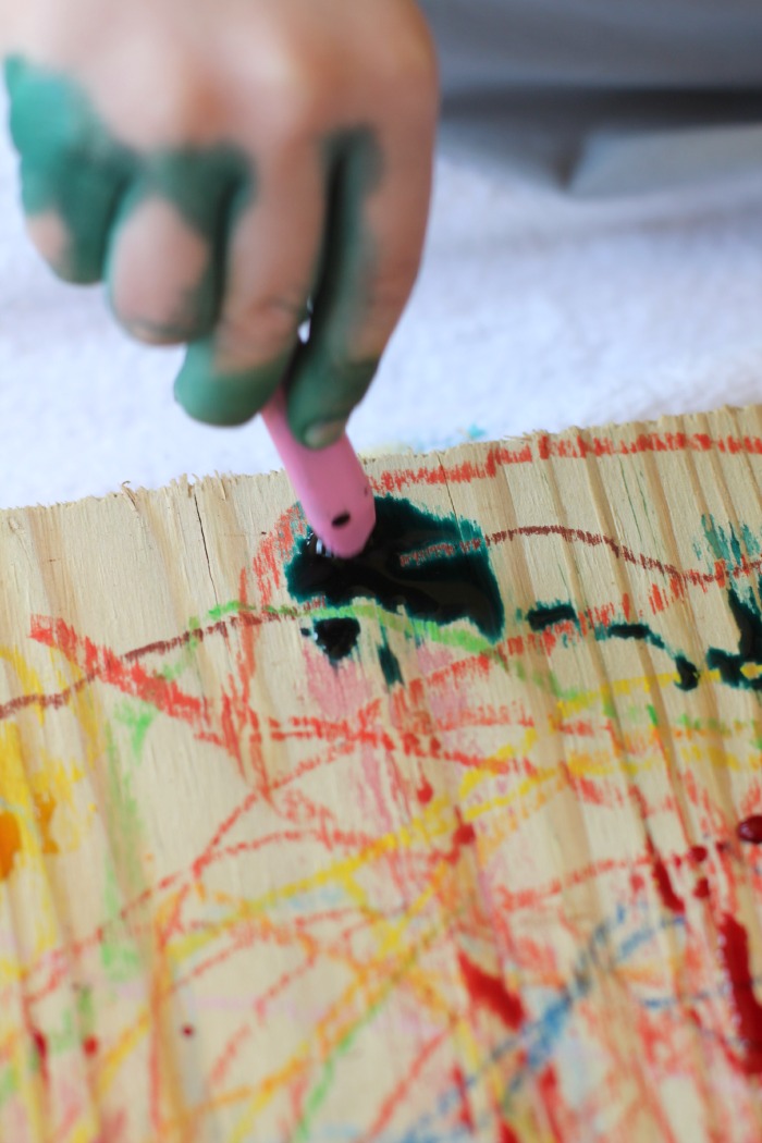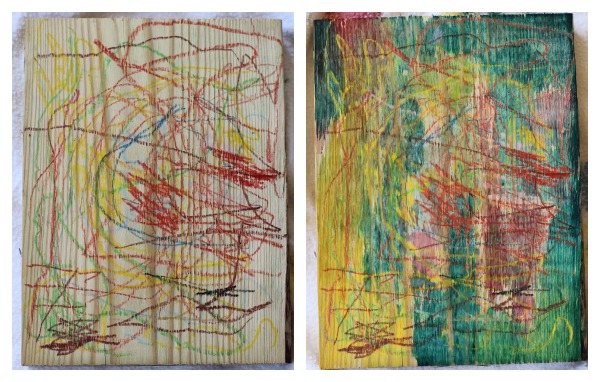 and let them have at it- the crayons melted slightly as they drew on the wood, but not enough to drip. The color just went on a bit thicker and more vibrant than they would have sans heating.