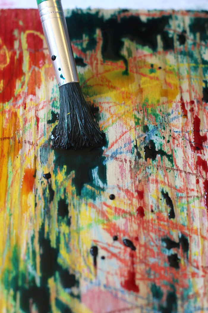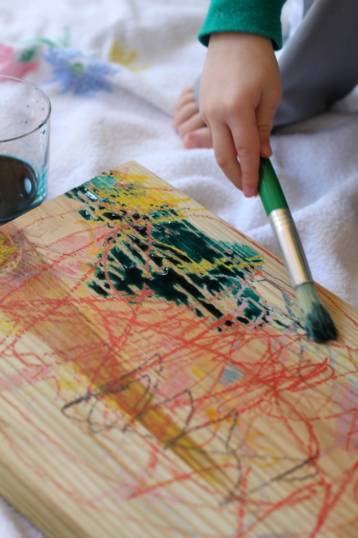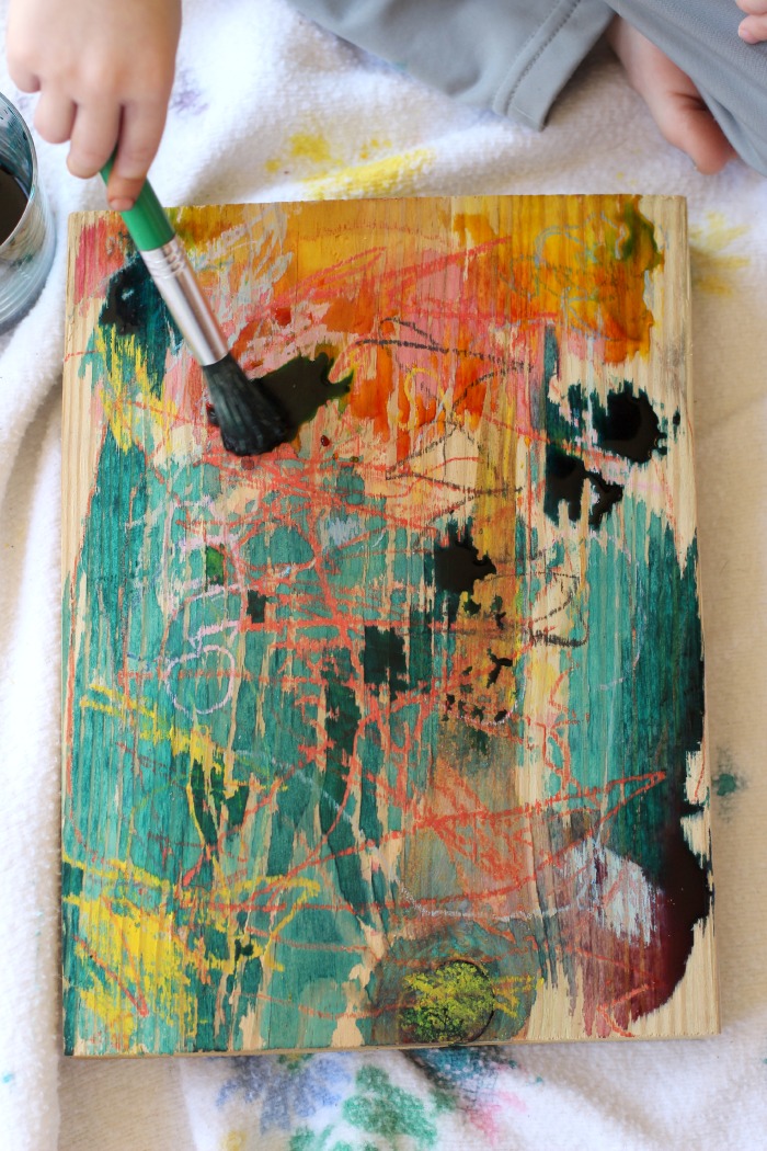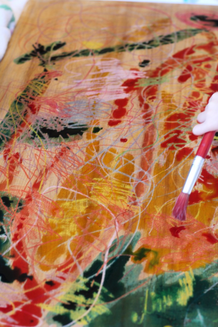 It turned out to be SUCH a cool effect- I love how colors of crayon that only faintly showed on the wood were made to pop after painted over with the watercolors, and the twins were totally engrossed.