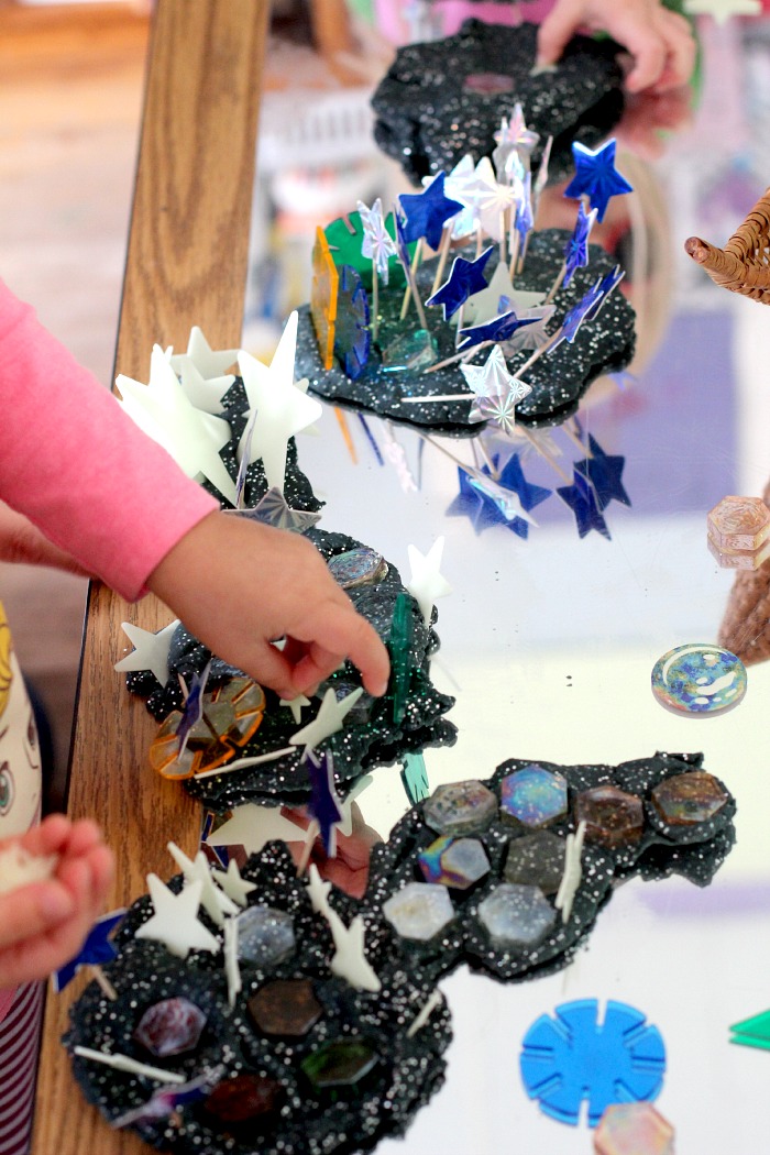 I first saw the idea for black sparkly playdough over at one of my favorite blogs, Fairy Dust Teaching. I’ve also seen versions at The Imagination Tree, Nurturstore, and Sunhats and Wellie boots, among others. I love it because it’s a fun, hands-on way to explore the concepts of space, night and day, light and dark, etc. Younger children will enjoy the sensory elements of the sparkly dough, while children with more developed symbolic play skills will enjoy using the dough in conjunction with loose parts and figures to create more elaborate play scenes. When I presented this to the 3-year-old class at the co-op, I placed our large acrylic mirror sheet on the table top for a work surface and then placed several baskets of playdough and loose parts out for them to explore, including a variety of gems in interesting shapes and colors, star cupcake toppers, and astronaut figures that I picked up at a discount store. All seven of the children were super engaged and made some pretty fantastic creations (more classroom photos can be found on our co-op Facebook page).