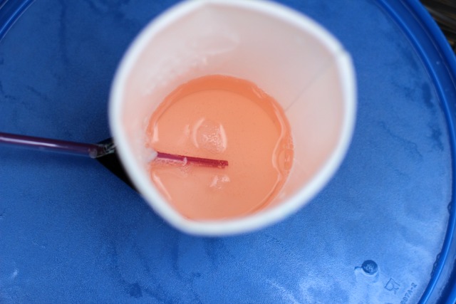 To begin, poke a hole for your straw in the side of your cup just a few centimeters up from the bottom. Push your straw into the cup through the hole (see photo below).