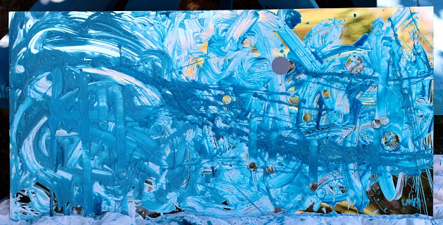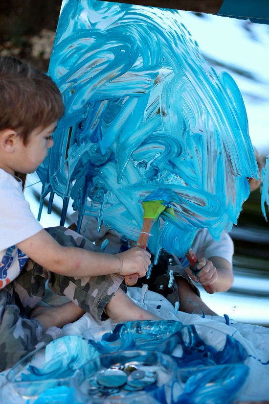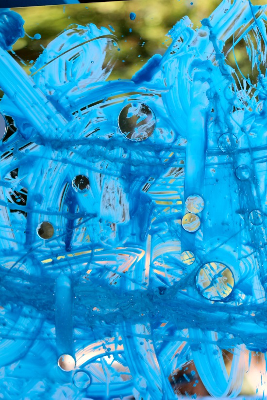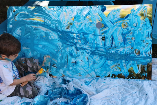 Here is a photo of the completed “sky”- you can see where Will decided to start flinging the paint onto the mirror with his brush. I knew he was done with his creation when he began painting his feet instead 😉 We admired it, photographed it, and eventually hosed it down so the mirror would be ready for another day of play and learning.