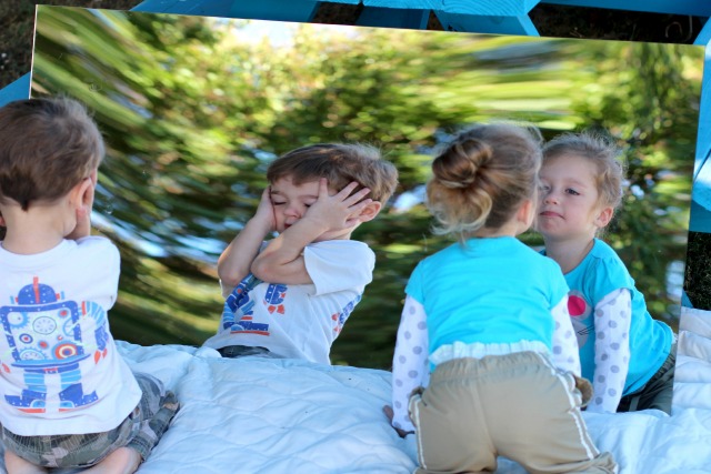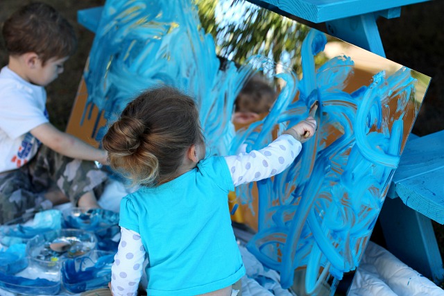 that I purchased for art and construction activities at Home Depot. We have painted on mirrors before, but never with this large of a surface area! I set it up outside against our picnic table and the twins were instantly drawn to it, making silly faces and looking at the reflection of our surroundings.