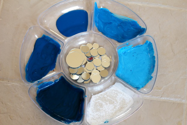 The symbolism of the round mirror tiles was not lost on the twins- they spend considerable time placing the “stars” and “moons” just right. Interestingly, the smaller tiles had a tendency to slide down through the paint, also a source of fascination (and occasional frustration).
