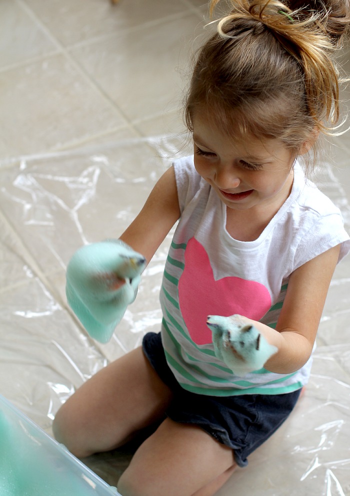 When the twins walked in and saw their large tub of ocean foam, they were super excited and couldn’t wait to dive right in. I had hidden ocean creatures from the Safari Ltd Ocean TOOB