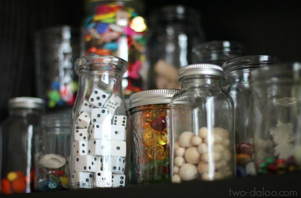 Having a relatively small learning spaces has forced us to critically evaluate our children’s toys, art supplies, etc. in order to keep things accessible, inviting, and (reasonably) uncluttered. I welcome this challenge because I do believe that children who are overstimulated by too much in their environment are less likely to engage in focused play or exploration. We’ve managed to pare down the toys and books magnificently…the hardest thing for me is our art and project supplies. I never met a loose part I didn’t love, and it’s just so hard to give up any of our stash!