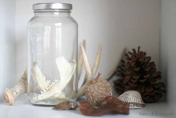 A respect for and interest in the natural world is a big part of our homeschool philosophy, so including natural elements such as plants, wood, and various other objects/ephemera throughout our home is important to us. Below are some found nature objects, including a possum jawbone that we found in the woods (and I cleaned myself, eek!).