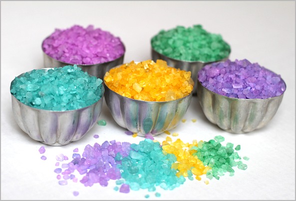 That’s it! One almost-full box of ice cream salt yielded plenty of colorful goodness. I simply split the salt between five different gallon-size freezer bags, put a few squirts of liquid watercolors in each bag (for five different colors), massaged each bag to coat the salt (only took a minute or so), and then spread the salt on foil-lined cookie sheets to dry. I checked about an hour later and the salt was totally dry and ready to rock!