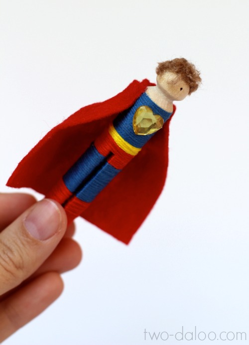 Yes, lovelies, your eyes do not deceive you. You see, last week I fell absolutely head-over-heels in love with these clothespin wrap dolls made by Amy, my newest blog crush over at This Heart of Mine (you really must go check out her lovely place ASAP!) and have been searching desperately for an excuse to make some ever since. Then it occurred to me that they would be the perfect tiny present to send to some of our pen pals, (we exchange letters with three sets of twins), so I set about making a few. One set of our “twin pals” has a serious thing for superheroes, so I decided to equip their dolls with the ability to leap tall buildings with a single bound, and so on and so forth.