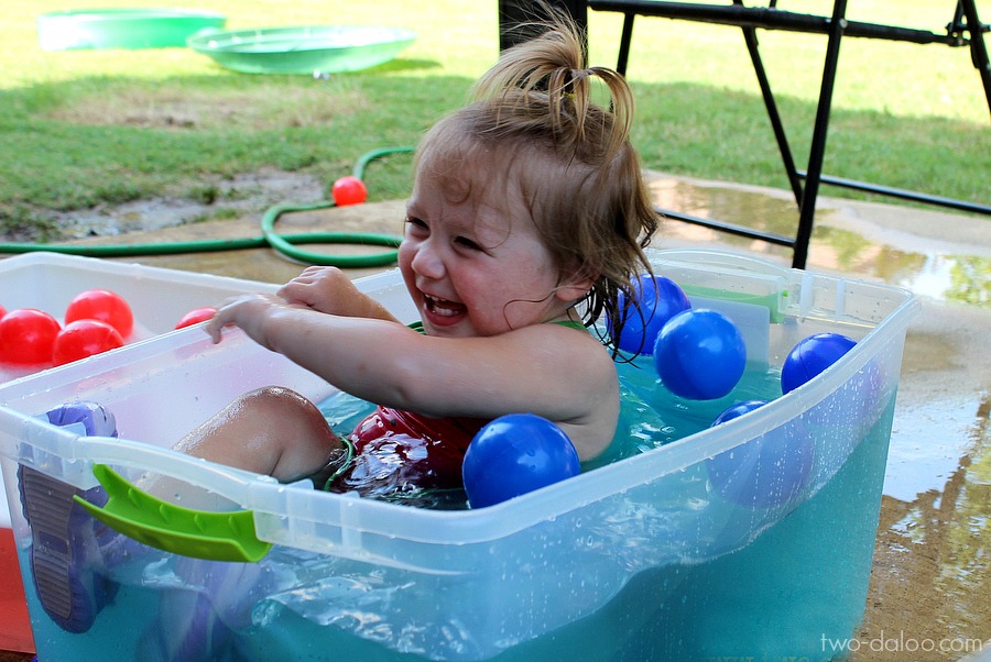 I wasn’t sure whether the twins would want to just play with the balls from outside the containers or jump right in, so I put them in their swimsuits just in case. Of course, they jumped right in and had such a great time climbing in and out of the different color tubs, splashing, kicking, and transferring the balls from one tub to the next. This was definitely one of the most simple and engaging activities we did that summer!