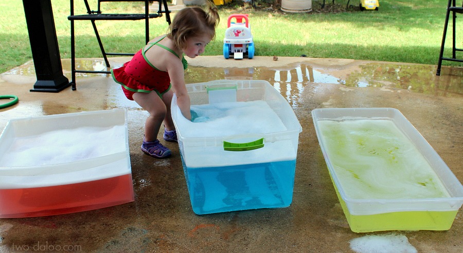This multi-sensory color exploration took only a few moments to prepare. First, I rounded up three clear plastic storage containers from around the house. I put those on our patio, added a squirt of bubble bath (I’d leave that out next time) and a few fizzy bath drops