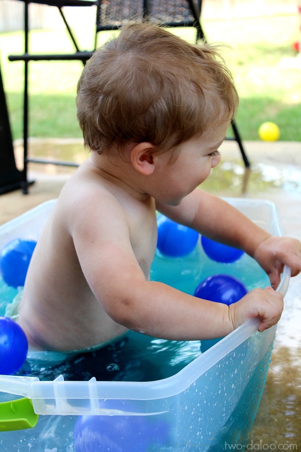 Next I added balls from our ball pit to match the colors in each tub. At this age, I just let the babies loose to explore the water as they pleased. A slightly older child might enjoy making a color-sorting game out of this…bring the balls out all mixed together in a container and have your child toss each ball into the matching tub of water. Lots of room to expand on this idea!