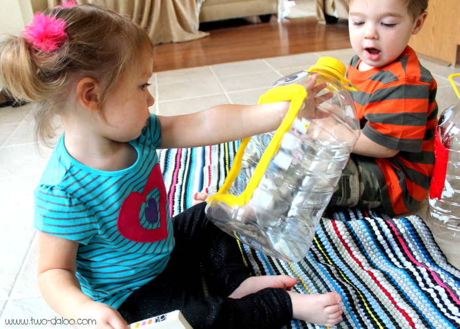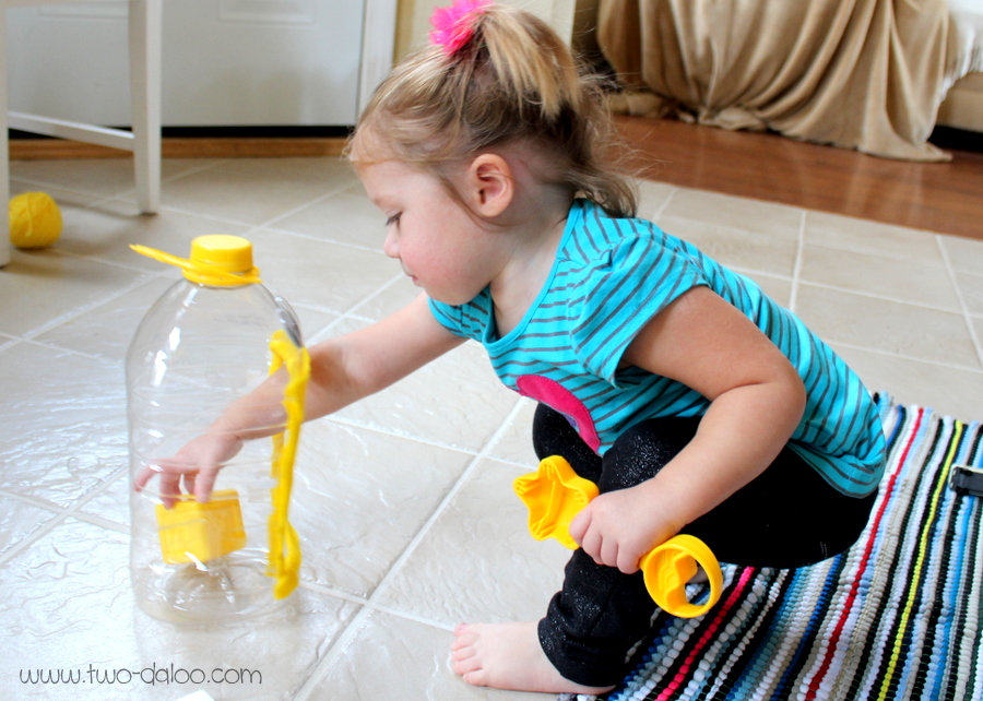 The activity morphed into a problem-solving exercise for Will, who decided he preferred putting objects into the top of the bottle instead of the mouth. Long after Sydney had moved on to the playroom, Will was still testing items, figuring out which ones would fit into the small opening.