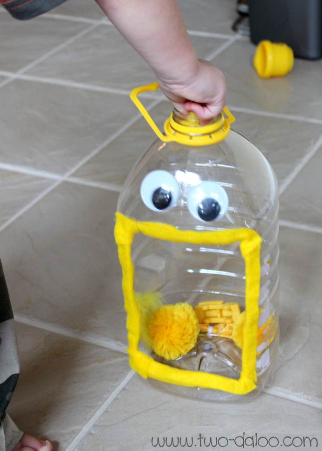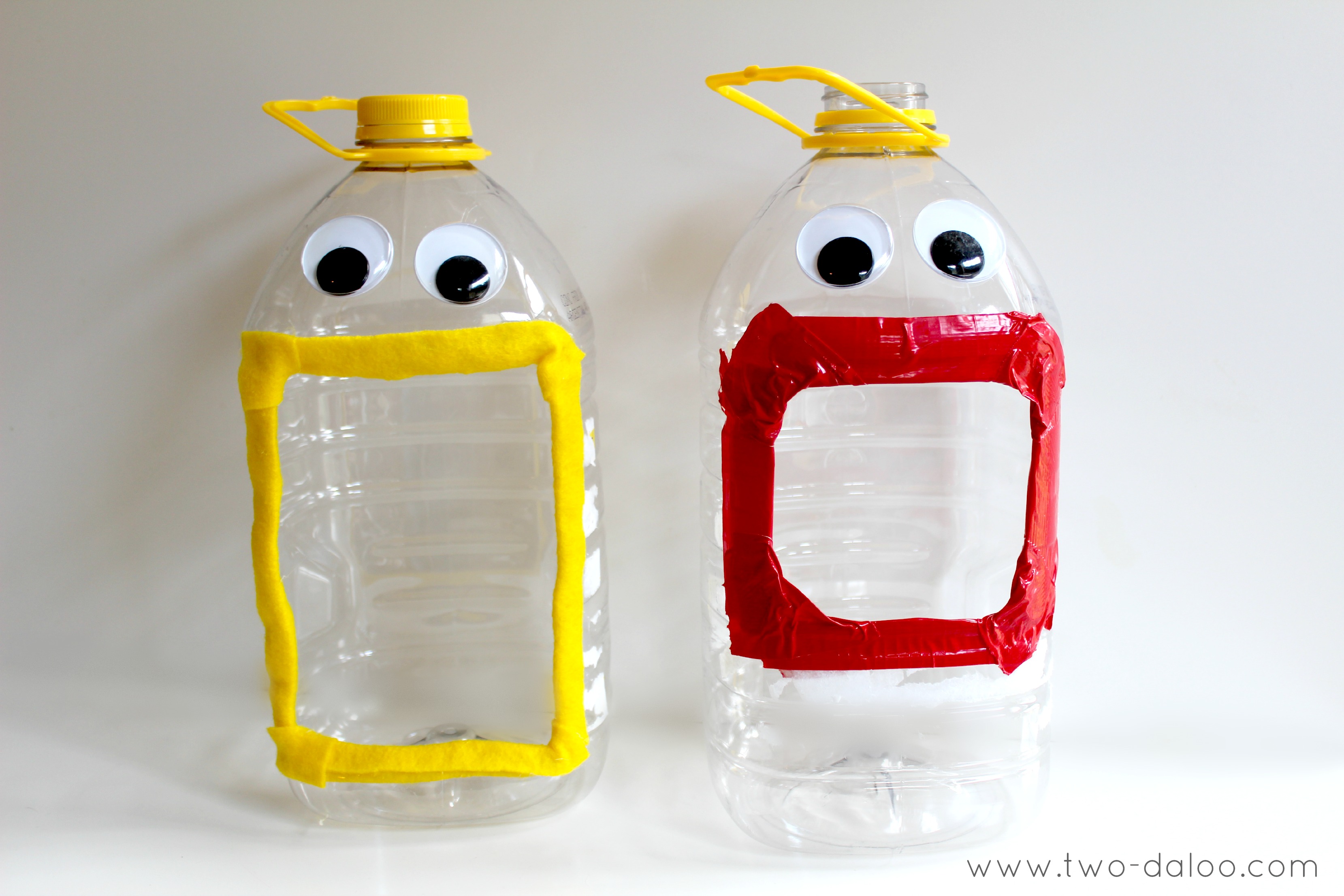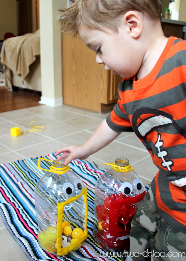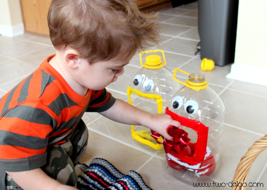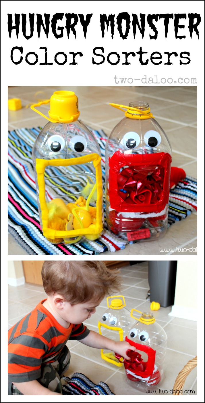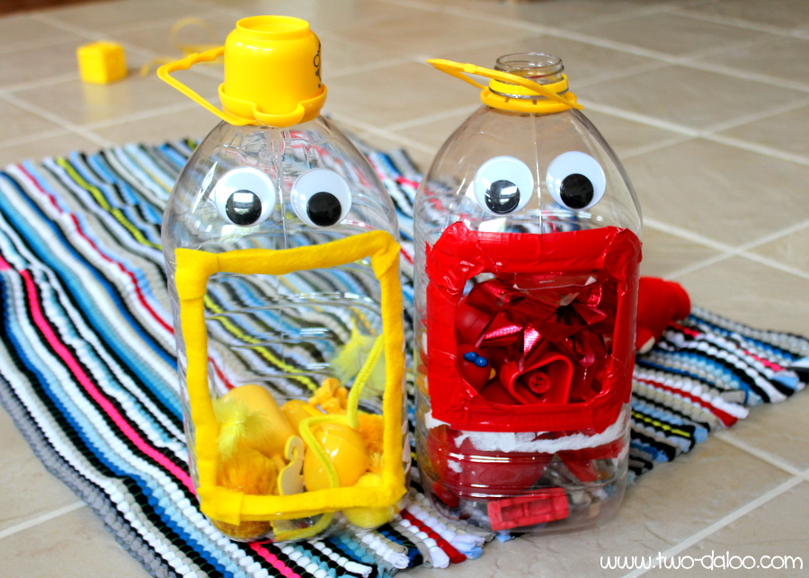 To create the color sorters, I simply took two large plastic apple juice bottles and cut out the front panel with a kitchen knife. To color the sharp/scratchy edges, I found some yellow felt left over from my weather board activity and hot glued it around the opening of one bottle. For the red bottle, I used some red duct tape left over from my giant duct tape building blocks. At this point, I stepped back and decided that the openings looked like giant mouths, so I grabbed some giant google-eyes from my crafty stash, glued them on, and voila! Instant monsters. You could get super creative with the construction of your “monsters”- I created mine in about ten minutes during nap time, but wouldn’t it be fun to have your children help you make these?